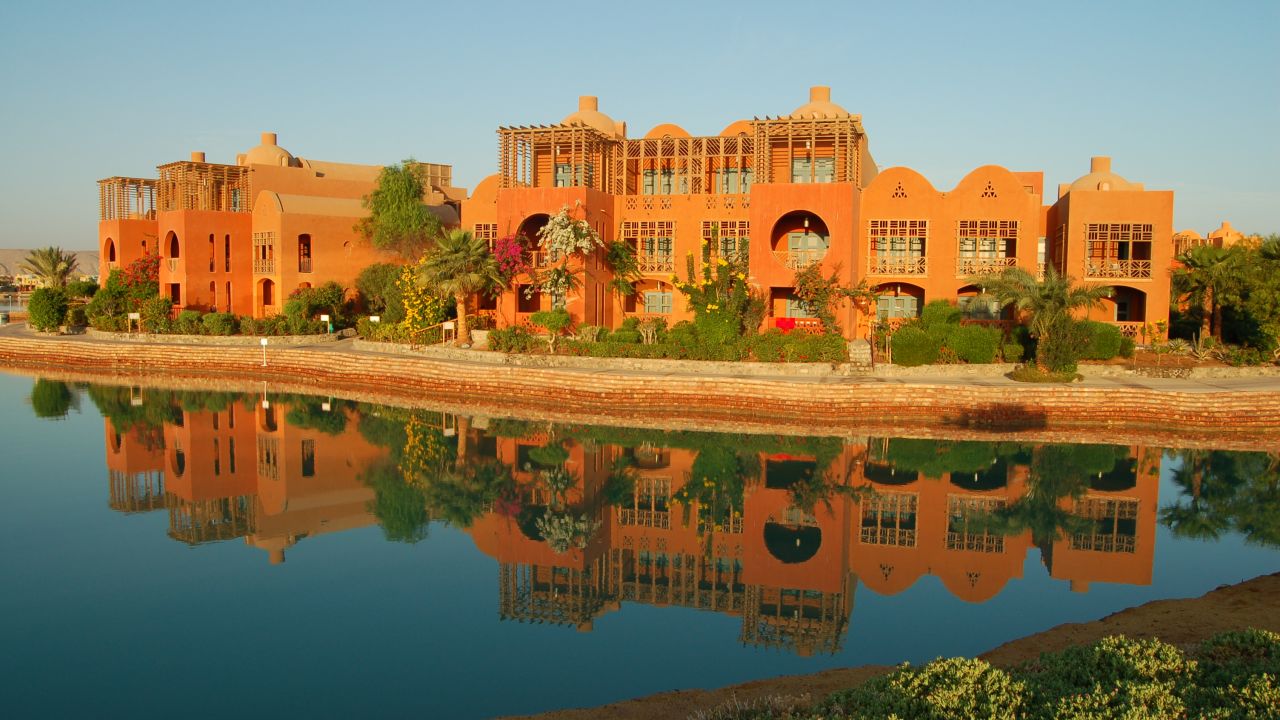 In El Gouna am roten Meer direkt in einer türkisblauen Lagune liegt das exklusivste Golfresort. Hier vermischt sich moderne Architektur mit regionaler Bautradition mit nubischen Veranschaulichung.